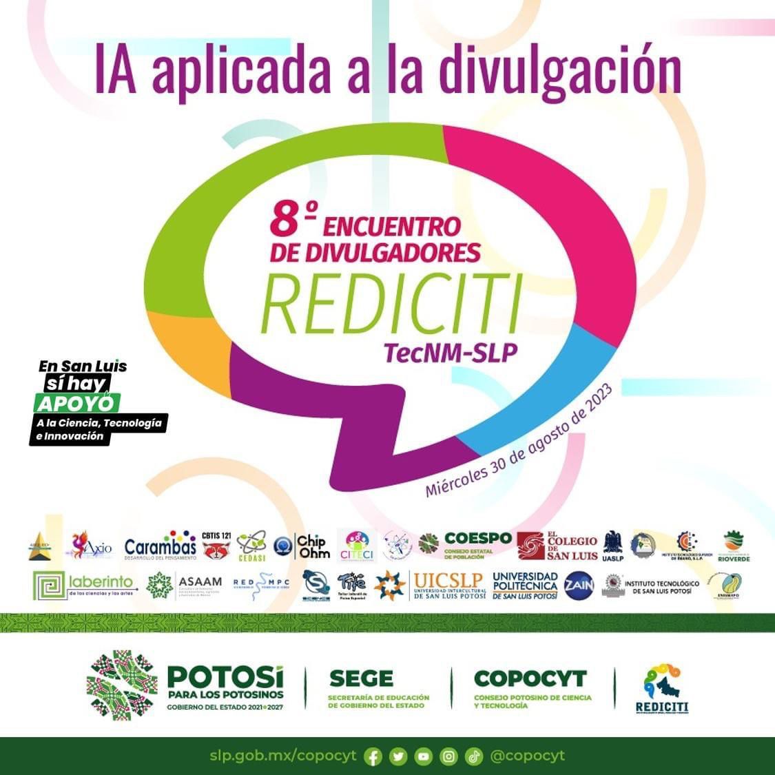 En apoyo a la divulgación de la ciencia, la tecnología y la innovación, el Gobierno del Estado, a través del Consejo Potosino de Ciencia y Tecnología (Copocyt), realizará el próximo miércoles 30 de agosto en el Instituto Tecnológico de San Luis Potosí, el “8° Encuentro de Divulgadores”, de la Red de Divulgación de Ciencia, Tecnología e Innovación (Rediciti), que, para esta edición, se enfocará en el uso de la inteligencia artificial.