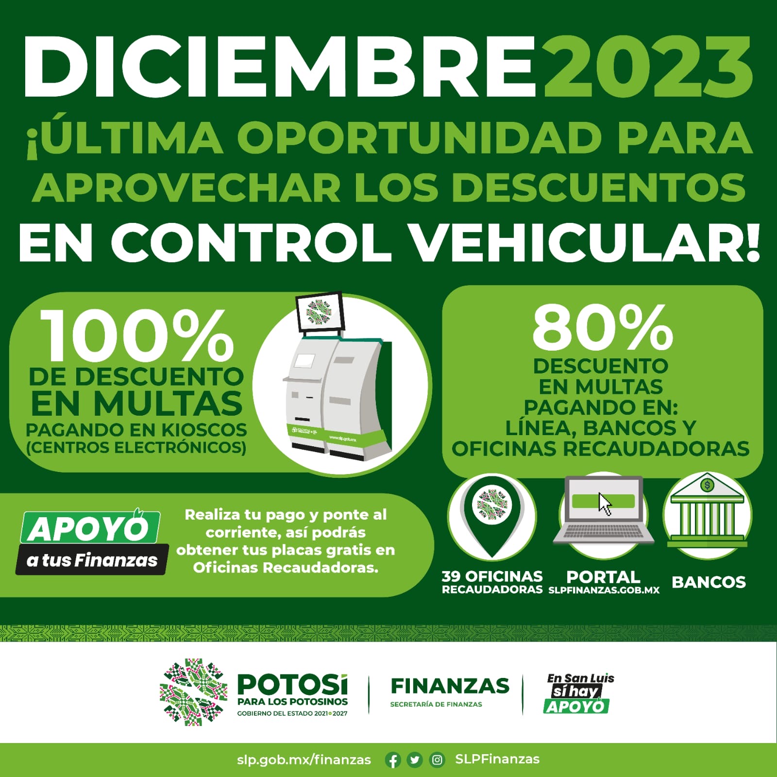 • La Secretaría de Finanzas dio a conocer que aplicará el 100 por ciento de descuento en multas de control vehicular pagando en módulos electrónicos, además del 80 por ciento para oficinas recaudadoras en apoyo a la economía de las familias