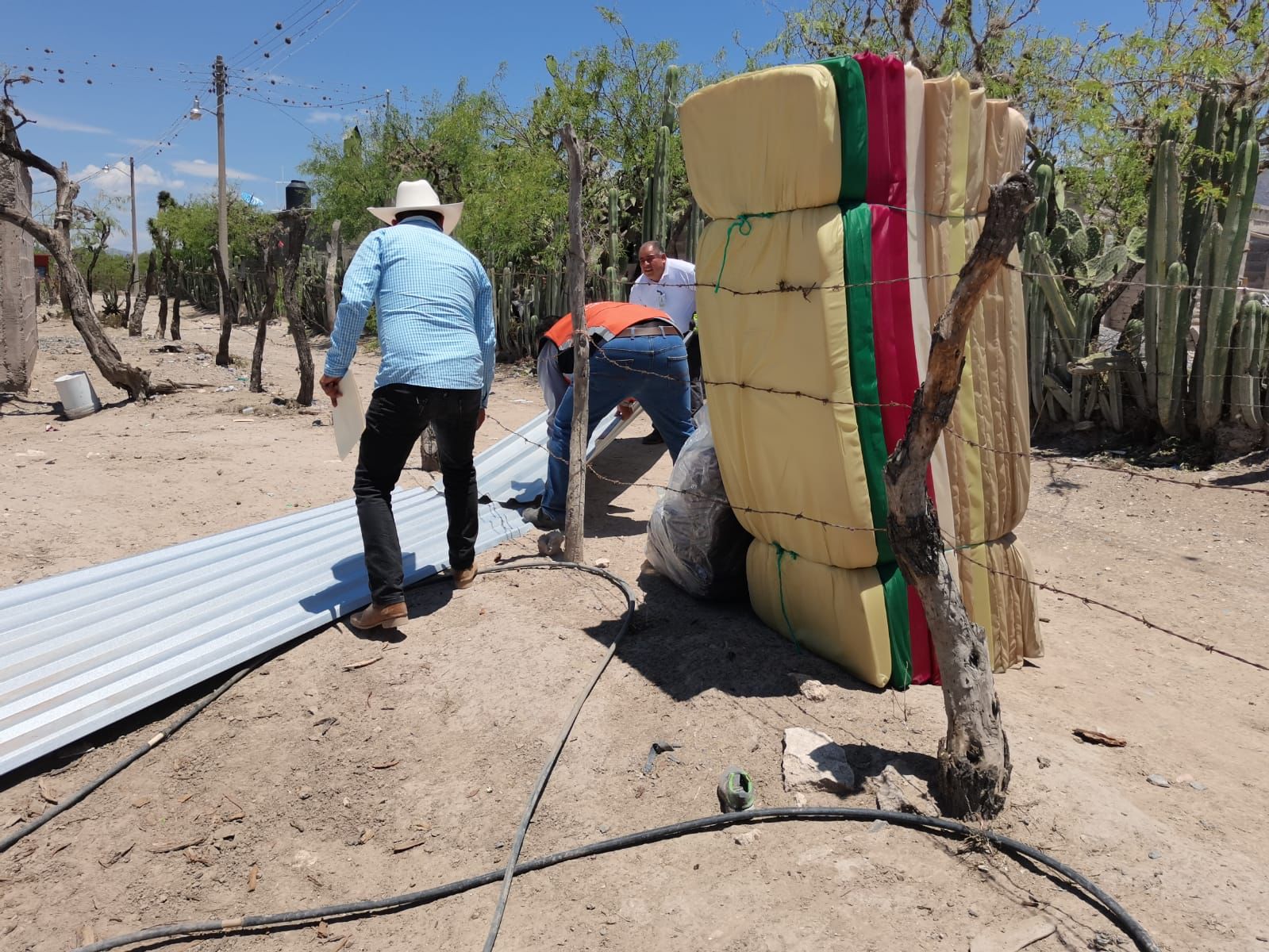 - A través de la Coordinación Estatal de Protección Civil, familias de tres comunidades del municipio de Villa Hidalgo reciben láminas, ropa, colchonetas, víveres y cobijas.