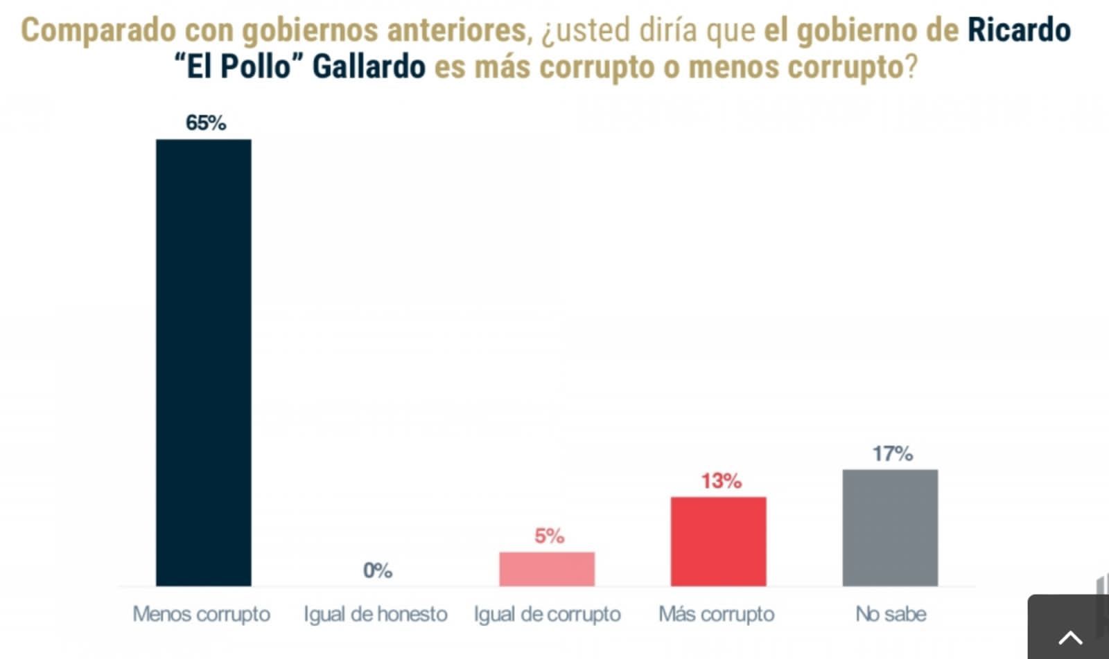 Además, el 65 por ciento de las personas encuestados afirmó que el gobierno de Ricardo Gallardo es menos corrupto que gobiernos anteriores; contra un 13 por ciento que dijo “más corrupto” y a la pregunta si el actual gobierno funciona, 73 por ciento respondió que sí, contra un 15 por ciento que respondió que no.