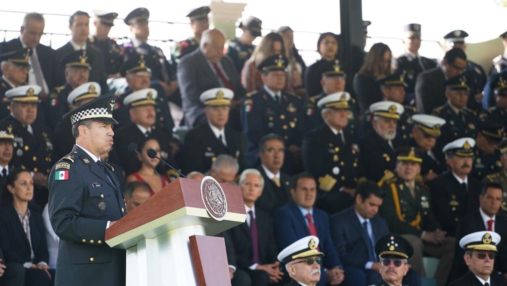 Durante la ceremonia, el Comandante de la Guardia Nacional, Luis Rodríguez Bucio, manifestó que la Guardia Nacional es una institución de carácter civil disciplinada y profesional cuyo objetivo es realizar funciones de seguridad pública con el fin de salvaguardar la seguridad de la población.