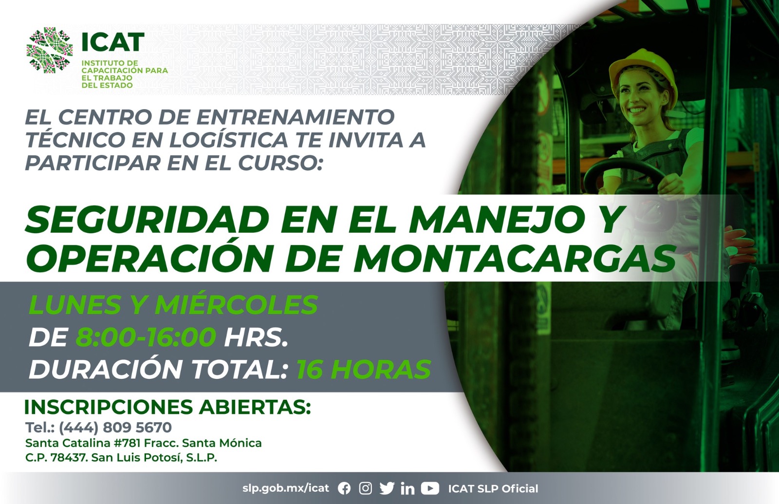 El curso se impartirá en las instalaciones del Centro de Entrenamiento Técnico en Logística (CETL) ubicado en calle Santa Catalina #798, fraccionamiento Santa Mónica, en Soledad de Graciano Sánchez, los lunes y miércoles en un horario de 8:00 a 16:00 horas con una duración de 16 horas. Para más información e inscripciones pueden llamar al (444) 809 5670 o enviar un texto al WhatsApp (444) 660 8298.