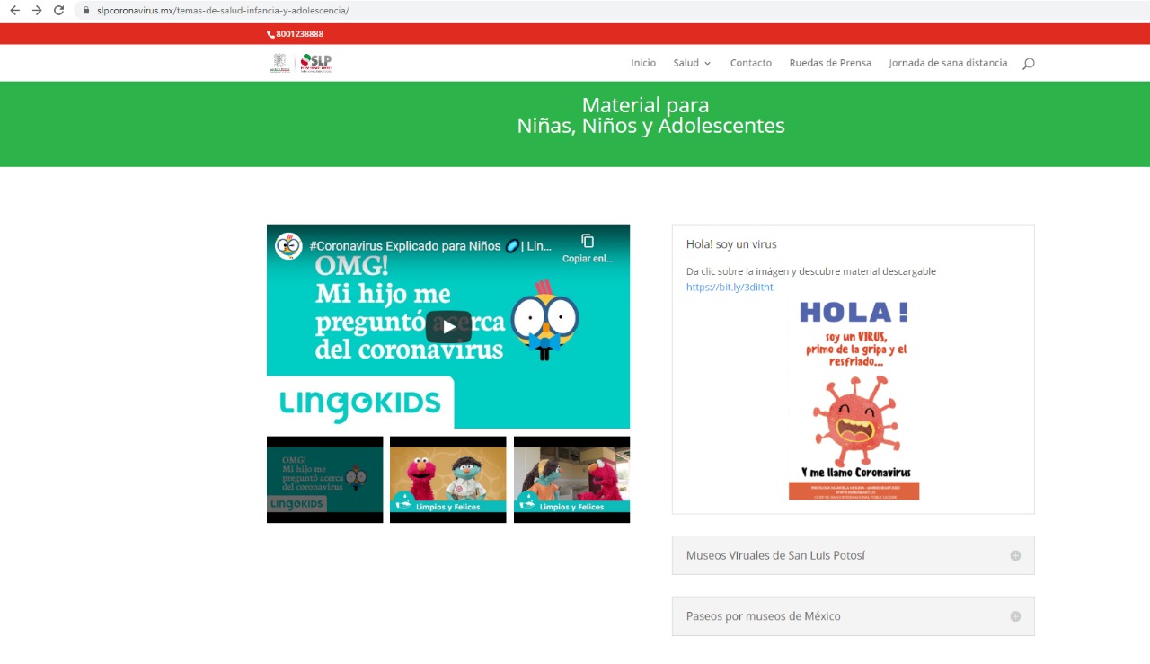 Además de que en esta página de internet se encuentra toda la información oficial sobre el Covid-19, preguntas frecuentes, mitos, enlaces a las conferencias de prensa que diariamente realiza el Gobierno del estado a través de la Secretaría de Salud, e infografía relevante para un correcto lavado de manos y lavado de superficies, esta herramienta tecnológica cuenta con una sección dedicada a la Infancia y Adolescencia.