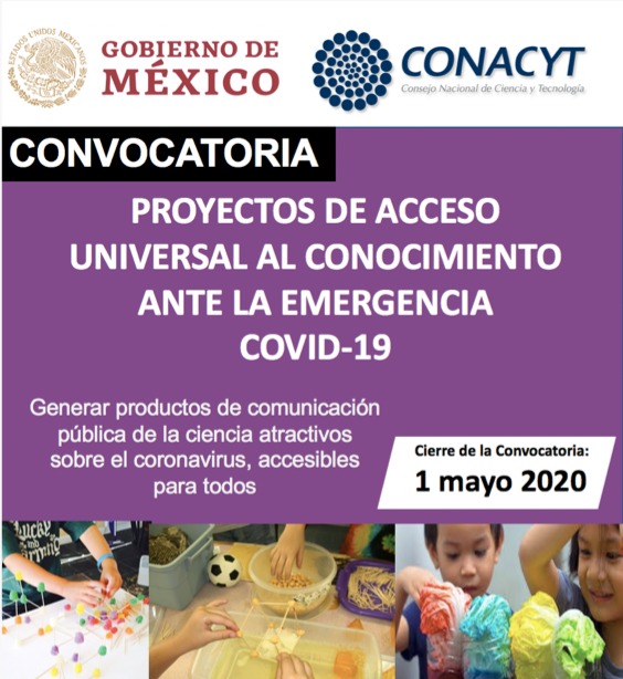 Con el objetivo de impulsar proyectos de acceso universal al conocimiento ante la emergencia de Covid-19, el Consejo Nacional de Ciencia y Tecnología (CONACYT), a través del Consejo Potosino de Ciencia y Tecnología (COPOCYT), emite la convocatoria virtual dirigida a las y los comunicadores de ciencias, periodistas, las y los creadores, artistas y personas físicas o morales, que cuenten con inscripción o preinscripción en el Registro Nacional de Instituciones y Empresas Científicas y Tecnológicas (Reniecyt).