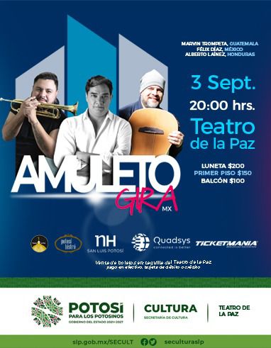 Tras una gira artística internacional por Guatemala, Honduras, Costa Rica y México, y gracias a la visión del Gobernador de San Luis Potosí, Ricardo Gallardo Cardona, para impulsar el talento local, la “Gira Amuleto” que une a tres cantautores internacionales, Marvin Trompeta de Guatemala, Jorge Laínez “Aullador” de Honduras y el potosino Félix Díaz, cerrará sus presentaciones en el majestuoso Teatro de la Paz el próximo 3 de septiembre a las 20:00 horas.