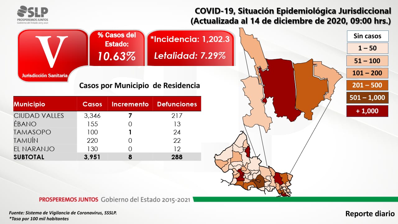 Al corte de este 15 de diciembre, esta región norte de la huasteca potosina se registraron 8 nuevos contagios, 7 de ellos con residencia en Ciudad Valles y 1 en Tamasopo, con lo que refleja un acumulado de 3 mil 951 casos confirmados; de igual manera mantiene los 288 decesos al no registrar nuevos desde el pasado 13 de diciembre.