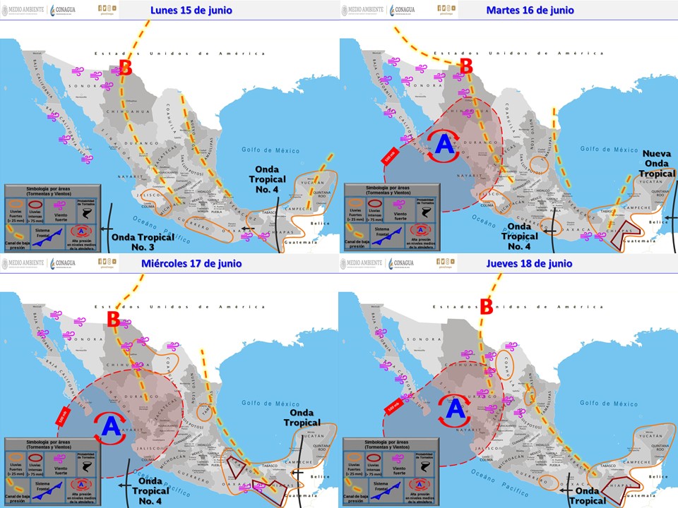 Durante el periodo de pronostico la Onda Tropical No. 4 recorrerá el sur y occidente de la República Mexicana durante el martes y miércoles, ocasionando chubascos y lluvias fuertes a puntuales muy fuertes acompañadas de actividad eléctrica, rachas de viento al paso de las tormentas y posibles granizadas sobre dichas regiones.