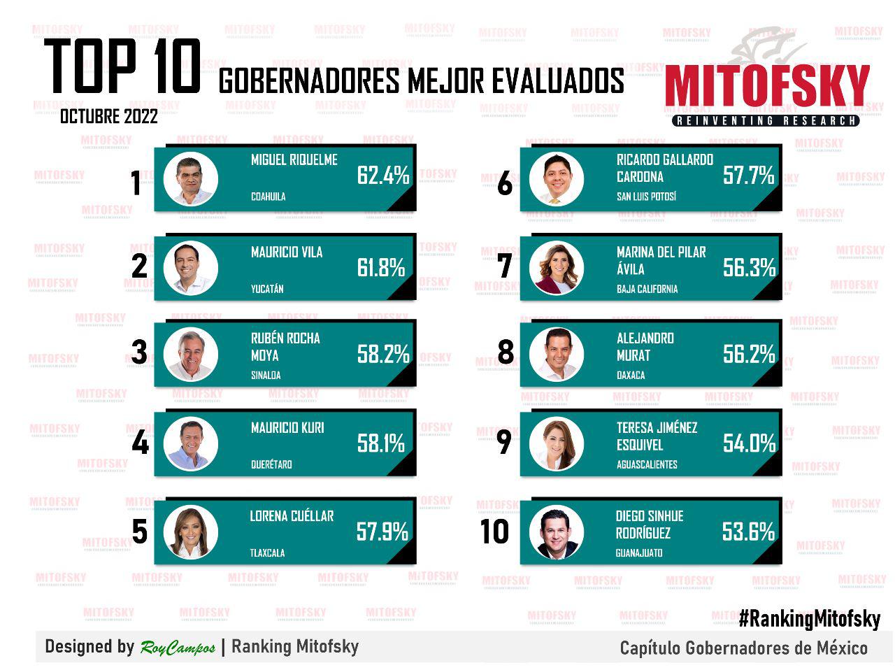 • De octubre del año 2021 al actual, el Mandatario Estatal avanzó 26 peldaños en el ranking, al mejorar de 31.8 por ciento a 57.7 de calificación