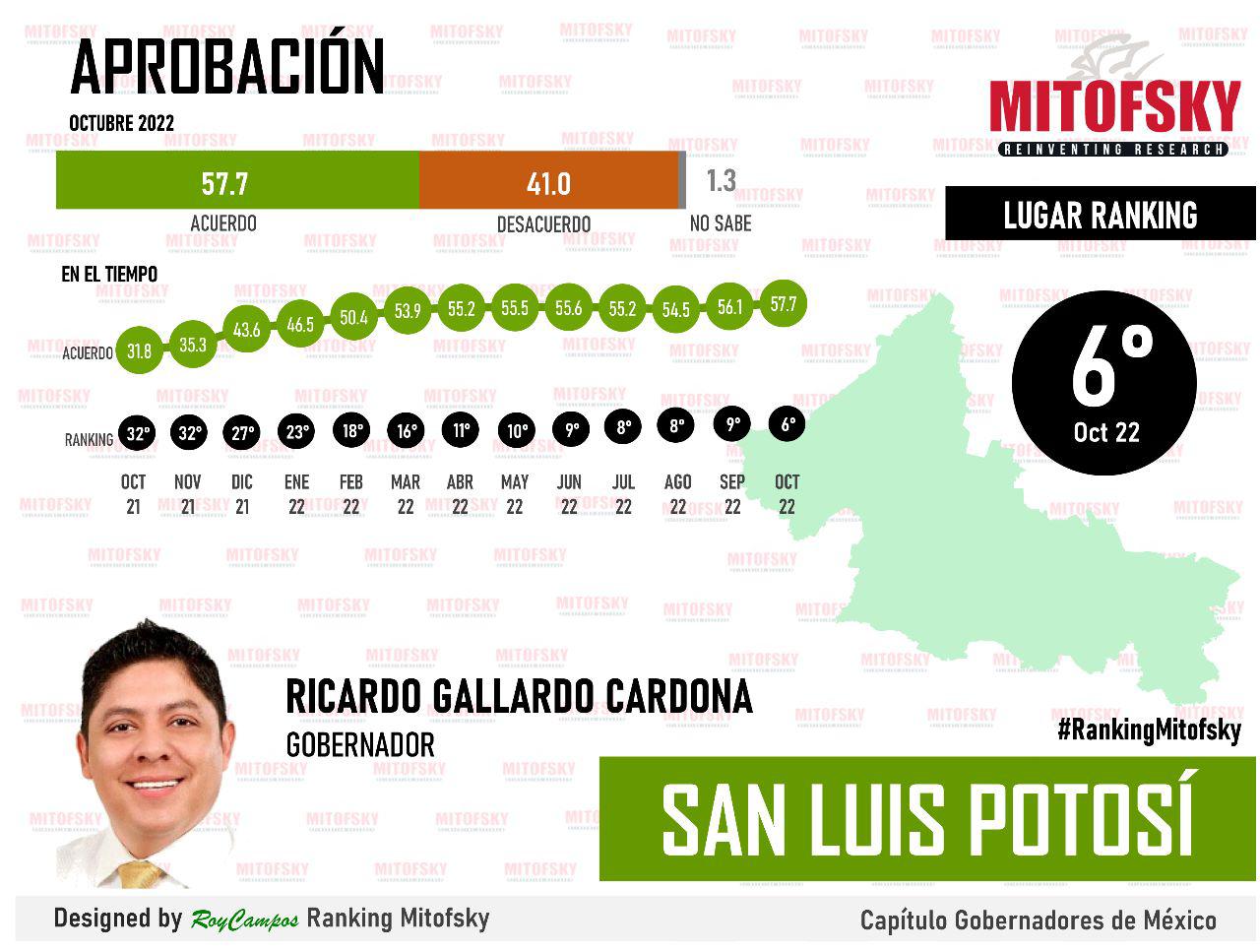 De acuerdo con el más reciente estudio de Mitofsky, el Gobernador Ricardo Gallardo, avanzó de la novena posición en el mes de septiembre a sexto para octubre, por arriba de los estados de Baja California, Oaxaca, Aguascalientes y Guanajuato, con lo que se refleja el apoyo de las familias potosinos y la aceptación de los diversos programas sociales y las obras de infraestructura que se han impulsado en la entidad.