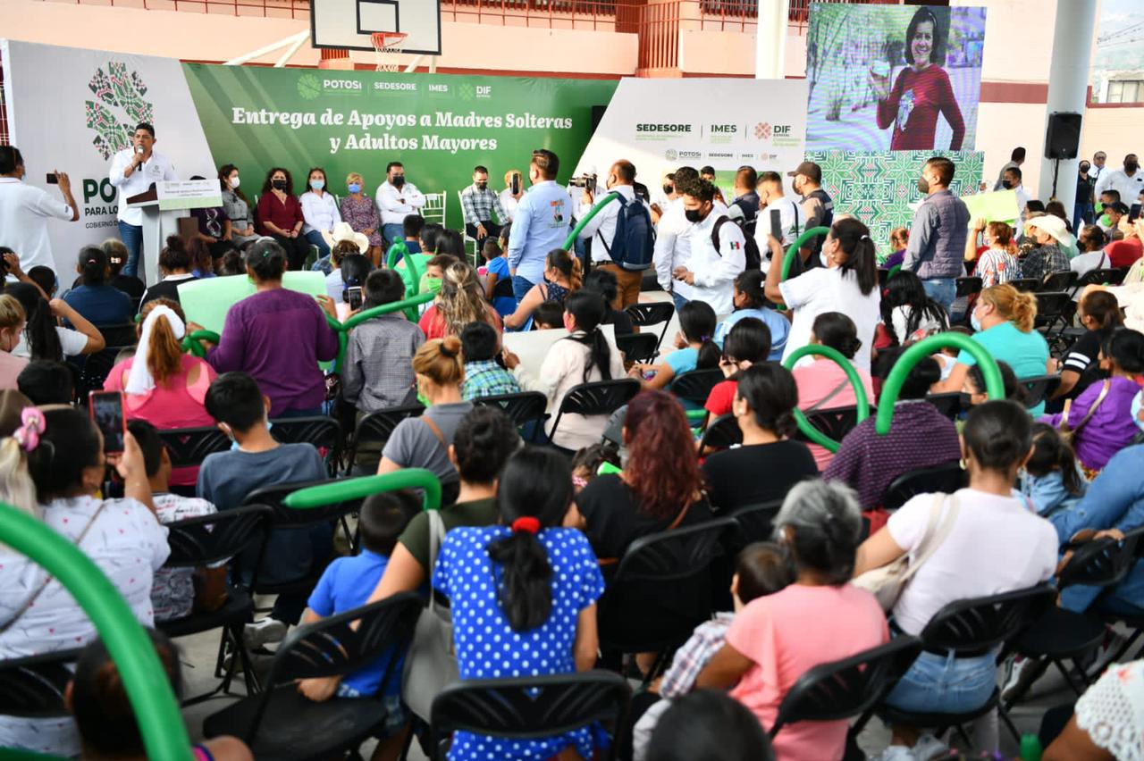 Acompañado de la calidez de las familias presentes, explicó que estos programas nacieron del clamor de las madres solteras y de las personas de la tercera edad que solicitaban el respaldo que por décadas le fue negado, por lo que el nuevo Gobierno se dio a la tarea de invertir en primera instancia 200 millones de pesos tan sólo en el presente año: “Logramos un ahorro considerable al quitar privilegios y comodidades a funcionarios de primer nivel, y ahora estamos repartiendo al pueblo lo que les corresponde, porque había abandono por parte de sus autoridades y en el nuevo San Luis Potosí eso está cambiando”, dijo.
