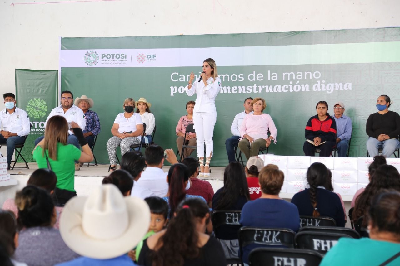 En la comunidad “La Memela” en el municipio de Ciudad del Maíz, Ruth González Silva, presidenta del Sistema Estatal para el Desarrollo Integral de la Familia (DIF) de San Luis Potosí, encabezó la entrega de más de mil 200 Kits Menstruales a adolescentes y mujeres adultas habitantes de la región, con parte de la meta de dotar a más de 30 mil potosinas de estos insumos de higiene menstrual en todo el Estado.