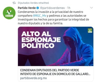 Adicionalmente, el Grupo Parlamentario del PVEM en la Cámara de Diputados, condenó enérgicamente la invasión a la privacidad de la que fue objeto Gallardo Cardona, y se unió al llamado a las autoridades para que realicen las investigaciones necesarias para el esclarecimiento de estos hechos.