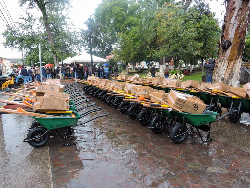 Mientras que, en Fernández y Lagunillas, se entregaron 5 tractores agrícolas, 19 implementos agrícolas, rastras, molinos, arados y segadoras, así como 80 paquetes de herramientas y 38 mochilas aspersoras.