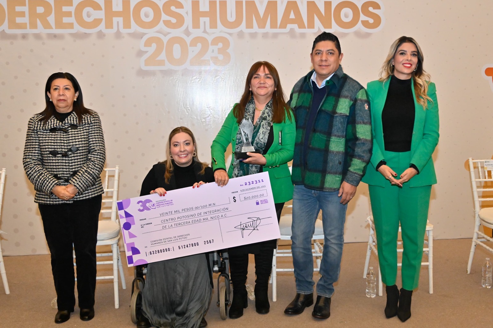 Al refrendar el compromiso del Gobierno del Estado a favor de los derechos fundamentales de todas y de todos en las cuatro regiones, el Gobernador de San Luis Potosí Ricardo Gallardo Cardona, entregó el Premio Estatal de Derechos Humanos 2023, que organiza la Comisión Estatal de Derechos Humanos (CEDH), al “Centro Potosino de Integración de la Tercera Edad Ma. Nico”, AC.