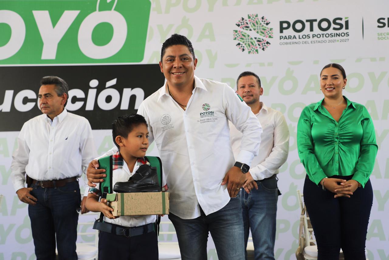 Tamazunchale, San Luis Potosí.- En un firme compromiso del Gobernador de San Luis Potosí Ricardo Gallardo Cardona por garantizar una educación de calidad en las cuatro regiones, este martes inició el Programa Entrega de Apoyos Escolares, en Tamazunchale en apoyo a más de 13 mil estudiantes quienes regresarán a clases con útiles, mochilas, zapatos y uniformes nuevos.