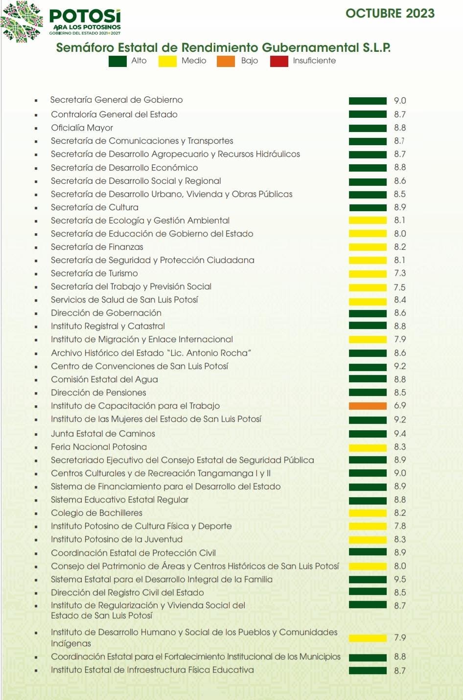 El Gobernador de San Luis Potosí Ricardo Gallardo Cardona, anunció los resultados del Semáforo de Rendimiento Gubernamental correspondiente al mes de octubre, que revelan un sólido desempeño de las y los funcionarios gubernamentales en apoyo a la ciudadanía, con el 64.2 por ciento de las dependencias estatales con calificación alta, solo una evaluación baja y sin que se hayan presentado registros insuficientes.