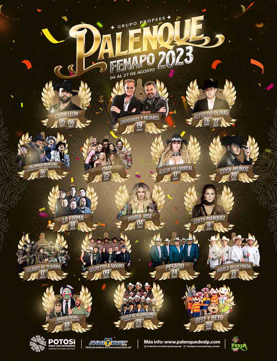 El Gobernador de San Luis Potosí Ricardo Gallardo Cardona, dio a conocer el cartel del palenque de la Feria Nacional Potosina (Fenapo), que se llevará a cabo del 4 al 27 de agosto del 2023, comenzando con María José y cerrando con Alfredo Olivas.