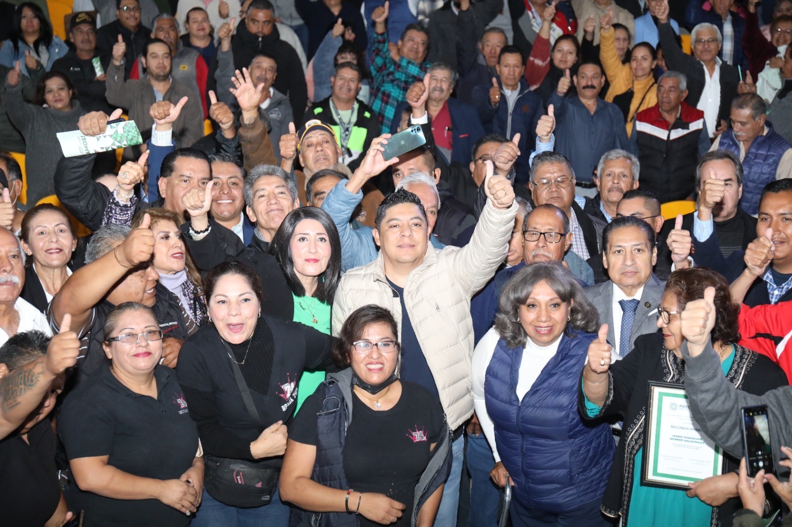 De forma simbólica, recibieron reconocimiento las y los taxistas: María Guadalupe Moreno Maldonado, por 30 años de servicio, en la región Media; Jesús Ernesto Rodríguez Moreno, por su servicio de honestidad, al devolver 5 mil pesos extraviadas en su unidad y Roberto Cervantes Martínez, el primero en acudir a la Revista 2023, ambos de la región Centro; así como Edgar Manuel Rodríguez Pérez, por su Excelencia en el Servicio, en el Altiplano.