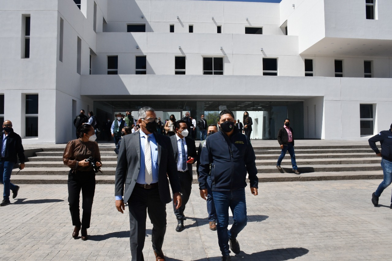 Luego de efectuarse la Mesa de Seguridad en el auditorio de este edificio, en donde se abordaron las estrategias a seguir en materia de prevención y procuración de justicia, las autoridades presentes hicieron una visita para conocer los avances de la obra.