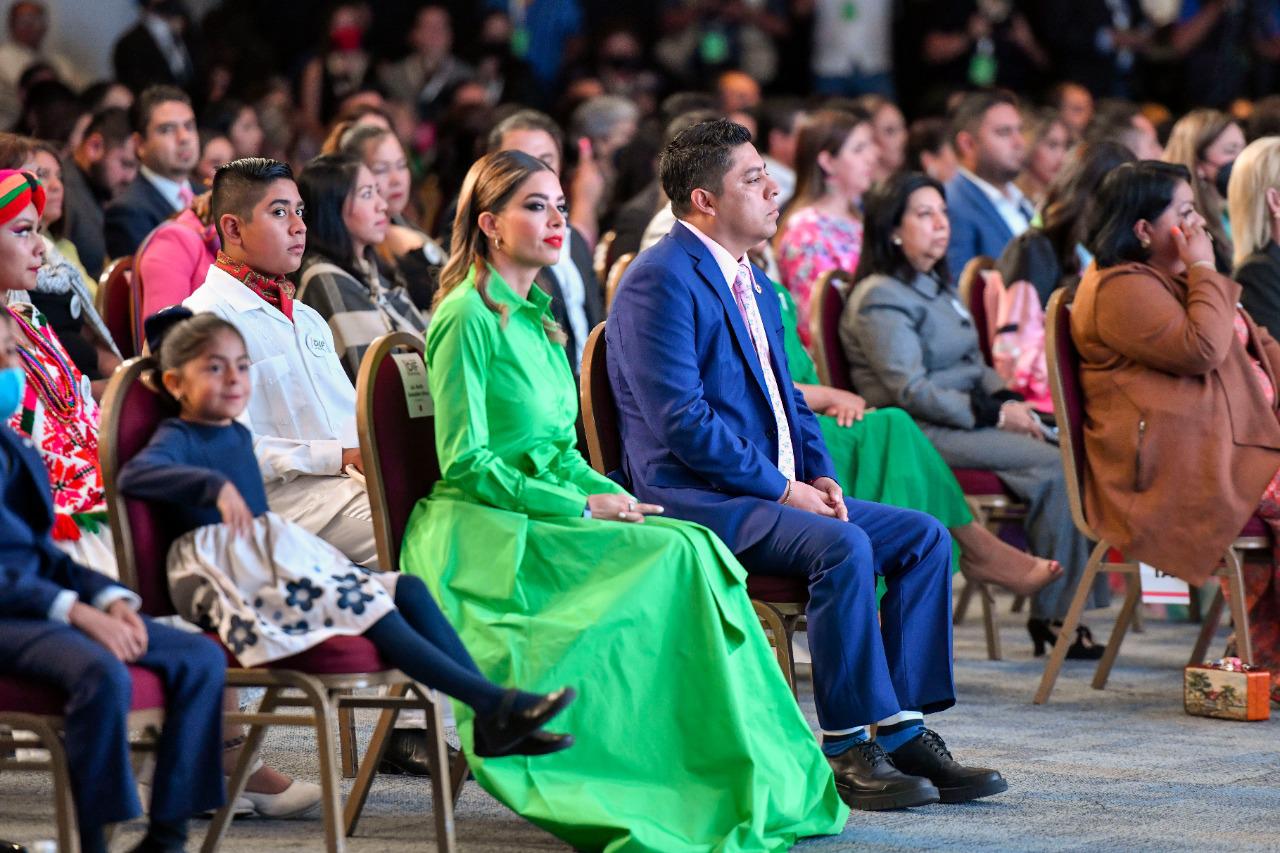 AcompaĂąada del Gobernador de San Luis PotosĂ, Ricardo Gallardo Cardona, ante un auditorio de mĂĄs de mil personas en el Centro de Convenciones de San Luis PotosĂ, la presidenta honoraria de la loable instituciĂłn reconociĂł el soporte interinstitucional y el compromiso del Gobierno del cambio con el DIF Estatal, al sumar esfuerzos para brindar una mejor calidad de vida a las y los potosinos de los 58 municipios en desventaja social.