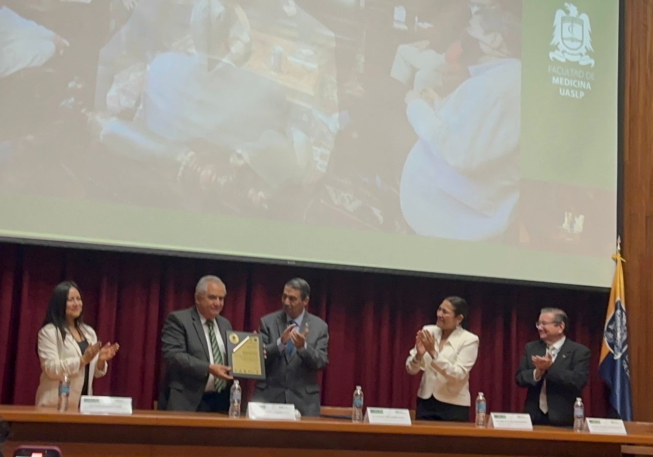 Acosta Díaz de León recibió el premio “Miguel Otero y Arce”, por parte de la Universidad Autónoma de San Luis Potosí (UASLP), en el marco de la inauguración del 16vo. Foro Estatal Interinstitucional de Bioética e Investigación en Salud, donde refrendó el compromiso del Gobierno del cambio con las y los investigadores, estudiantes y personal de salud.