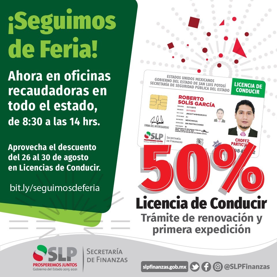 En reconocimiento a la gran respuesta de las y los potosinos de cumplir con realizar su trámite de licencias para conducir, así como en apoyo a la economía familiar, del 26 al 30 de agosto se aplicará el 50 por ciento de descuento, en las oficinas recaudadoras de todo el estado.