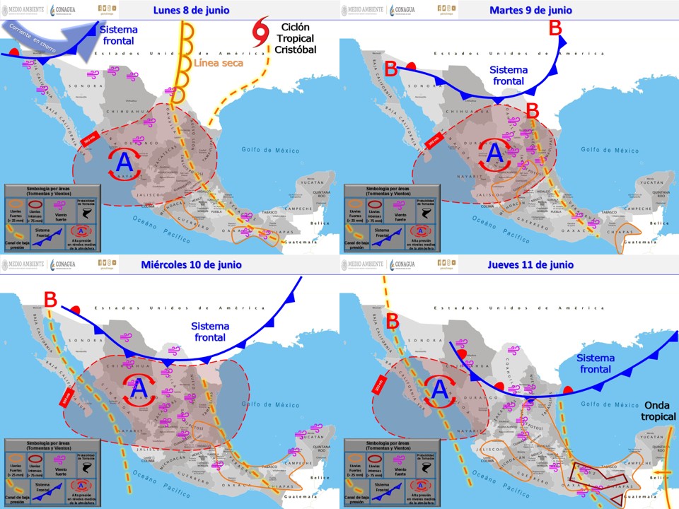 De acuerdo con los pronósticos para las próximas horas, se prevé que un canal de baja presión en el interior del territorio nacional y el ingreso de humedad del Océano Pacífico, originarán chubascos y lluvias fuertes acompañadas de descargas eléctricas, rachas de viento al paso de las tormentas y posibles granizadas en el occidente, centro, oriente, sur y sureste del país, incluido el Valle de México. Una línea seca sobre el norte de Coahuila y un nuevo frente frío extendido sobre el noroeste de México, originarán rachas de viento de 50 a 60 kilómetros por hora (km/h) en Baja California, Sonora, Chihuahua y Coahuila. Así mismo, una circulación de alta presión en niveles medios de la atmósfera mantendrá temperaturas máximas superiores a 40 grados Celsius (°C) en 8 entidades de la República Mexicana.