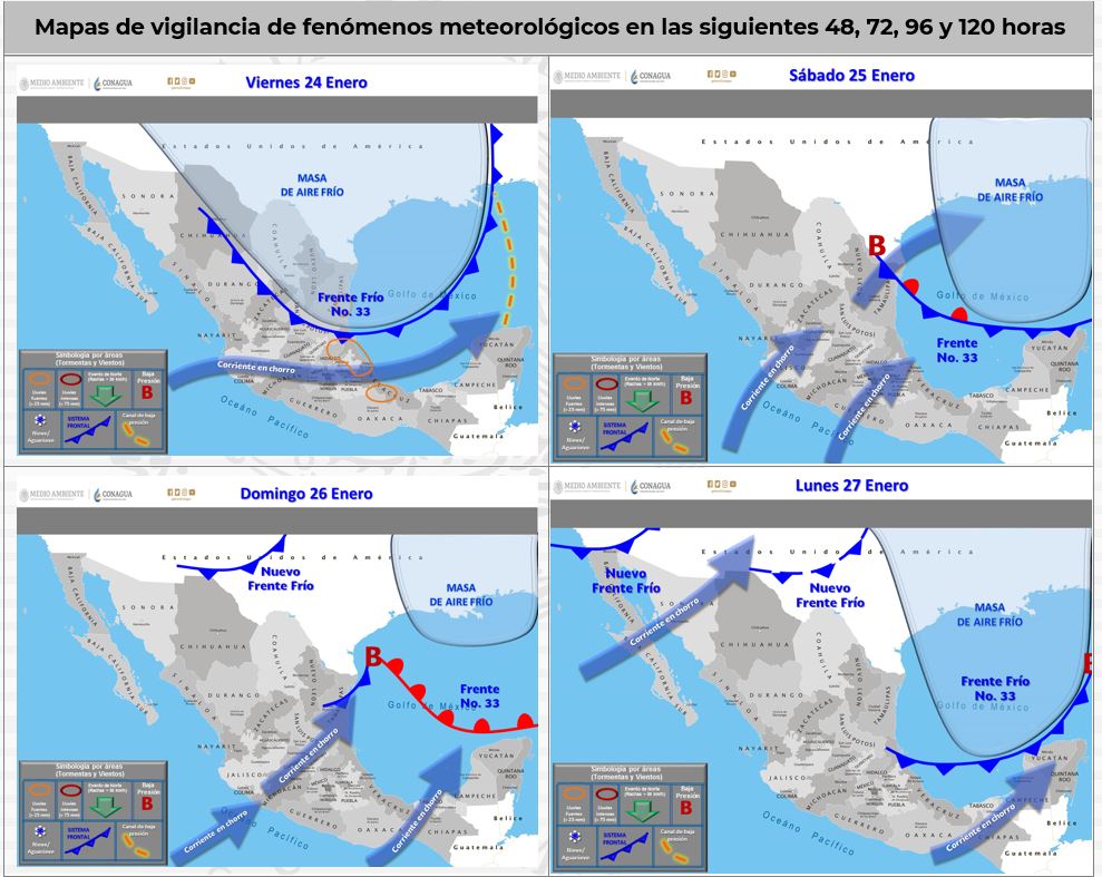 Durante el sábado y domingo, el Frente Frío No. 33 se extenderá sobre el occidente, centro y oriente del Golfo de México, así como en el norte de la Península de Yucatán, continuará interactuando con el arrastre de humedad asociado a un fuerte pulso de la corriente en chorro. Se prevé, que a partir del lunes el sistema se desplace hacia el oriente, alejándose del territorio nacional.