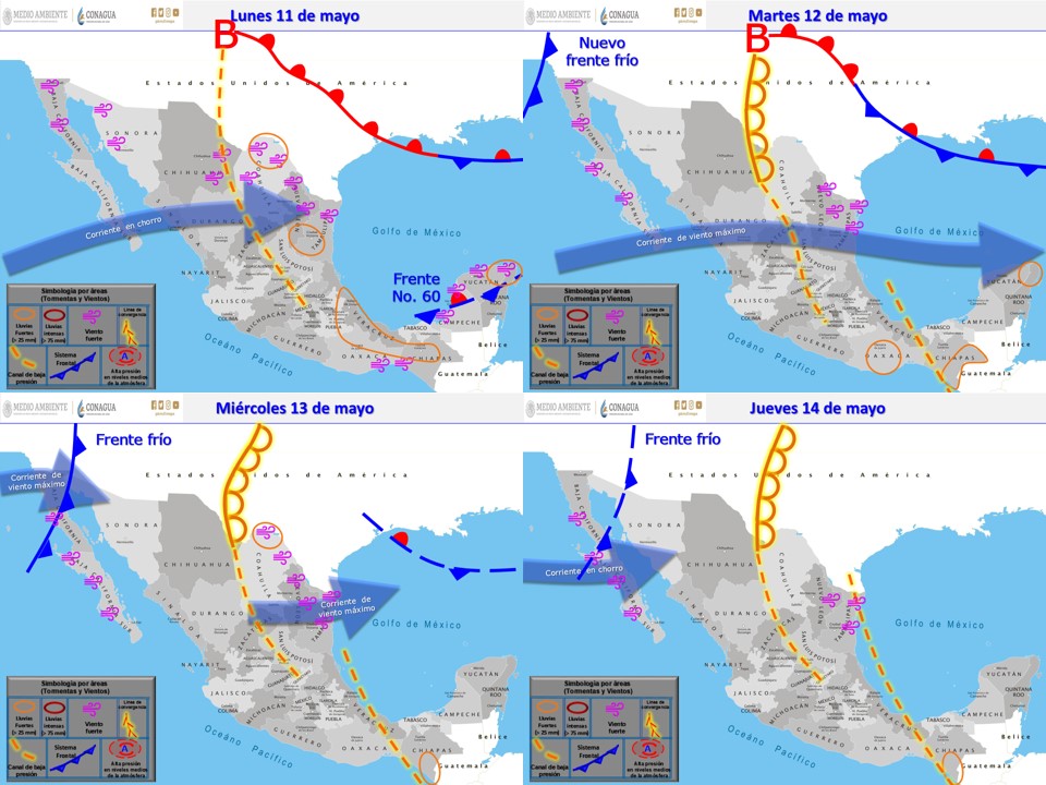 De acuerdo con los pronósticos para las próximas horas, se prevé que el Frente No. 60 se extenderá como estacionario sobre la Península de Yucatán; y ocasionará chubascos y lluvias fuertes a puntuales muy fuertes acompañadas de descargas eléctricas, posibles granizadas y rachas de viento durante el paso de las tormentas en Veracruz, Oaxaca, Chiapas, Tabasco, Campeche, Yucatán y Quintana Roo. La masa de aire que impulsa a dicho frente, originará viento de componente norte con rachas de 60 a 70 kilómetros por hora (km/h) en el Istmo y Golfo de Tehuantepec. Por otro lado, un canal de baja presión extendido sobre la Mesa del Norte y la Mesa Central, dará lugar a chubascos y lluvias puntuales fuertes con descargas eléctricas, posibles granizadas y rachas de viento durante las tormentas en el oriente y centro del territorio nacional, incluido el Valle de México.