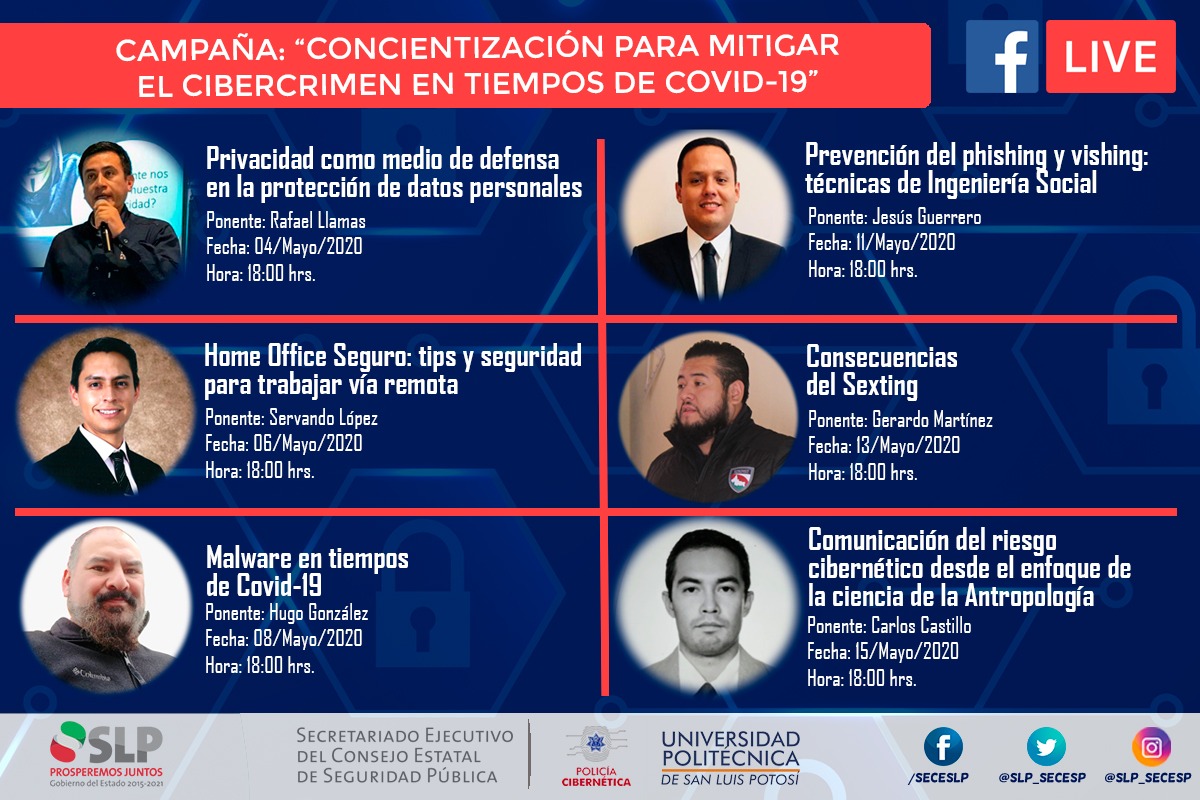 Oviedo Abrego hizo la invitación al público interesado para unirse a este proyecto que tiene como objetivo fortalecer la cultura de prevención en materia de ciberseguridad, ponencias que se llevarán a cabo de forma gratuita a través de Facebook Live en el enlace https://www.facebook.com/SECESLP/ los días 4, 6, 8, 11, 13 y 15 de mayo a las 18:00 horas.