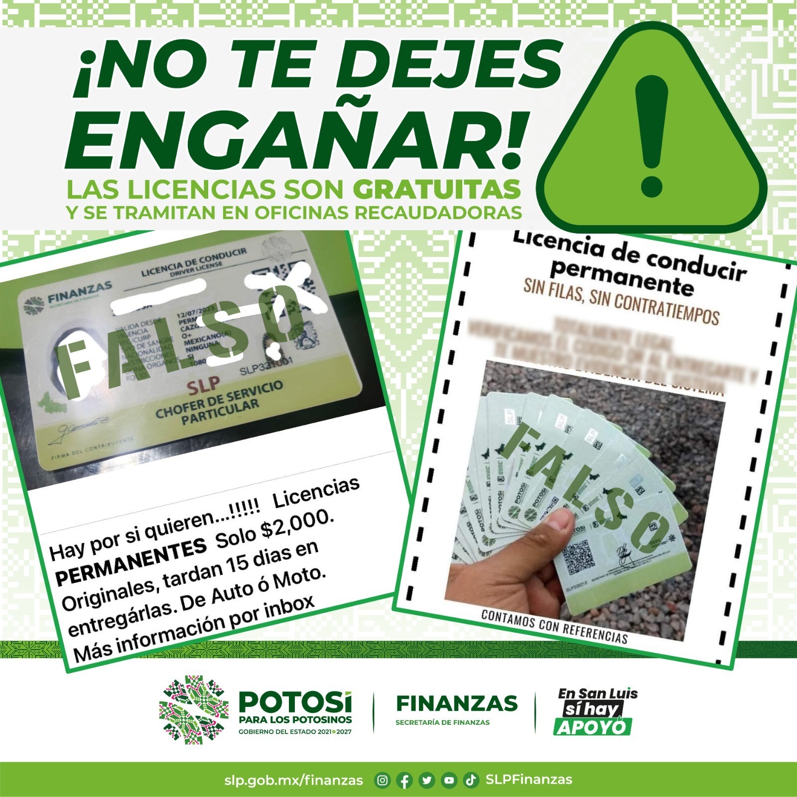 La Secretaría de Finanzas (Sefin), alertó a la población sobre la venta de licencias de conducir falsas a través de redes sociales, por lo que de inmediato se realizó la denuncia a las autoridades correspondientes y recordó que, en San Luis Potosí, la licencia es completamente gratuita y permanente, con un trámite sencillo y ágil, por lo que invitó a la población a no dejarse engañar y acercarse a las diferentes oficinas para obtener el documento oficial.