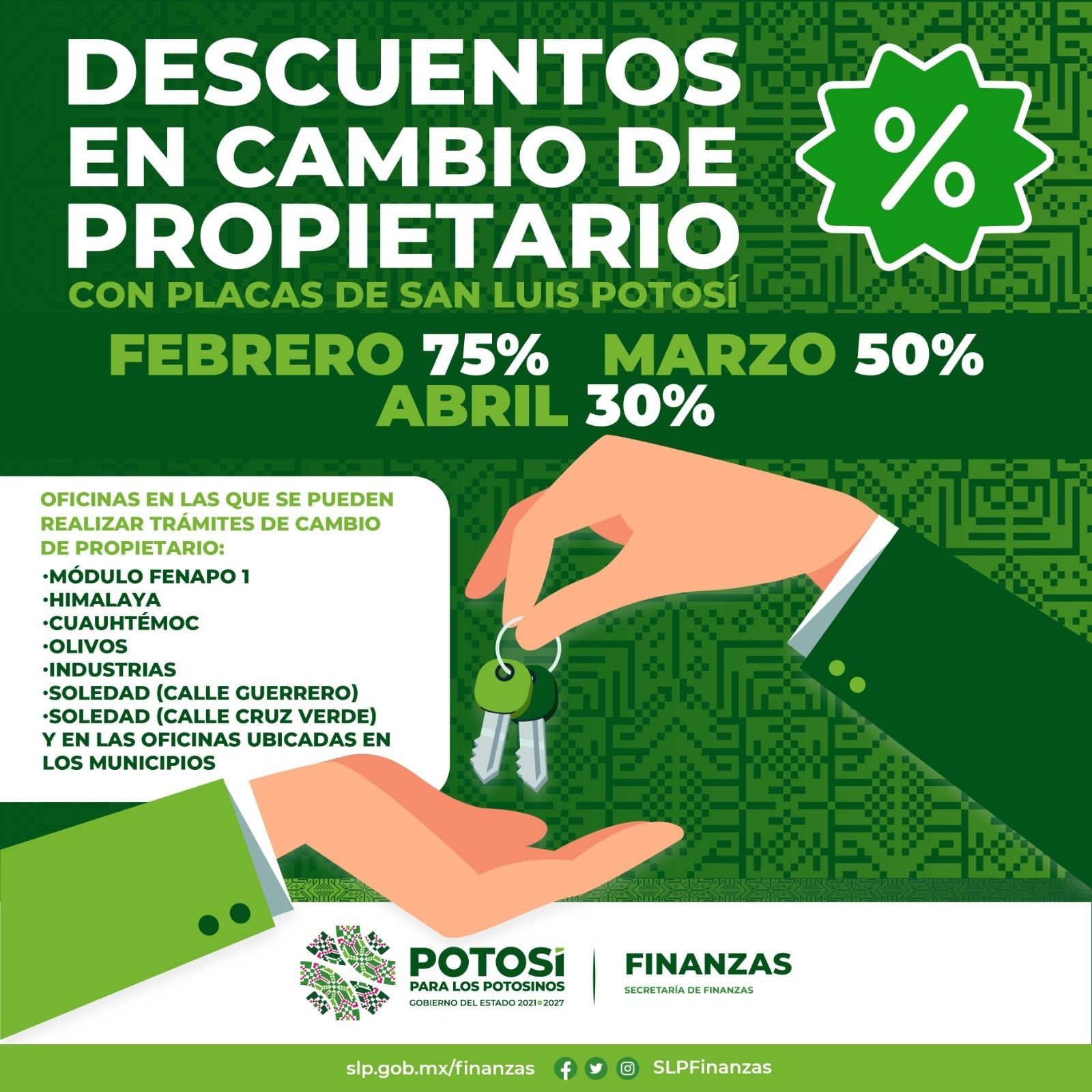 El Gobierno del cambio a travĂŠs de la SecretarĂa de Finanzas (Sefin) lleva a cabo la campaĂąa de descuentos para que las y los potosinos puedan realizar el cambio de propietario de vehĂculos con un 75 por ciento de descuento durante febrero, 50 por ciento en marzo y 30 por ciento en abril, informĂł Salvador GonzĂĄlez MartĂnez titular de la dependencia.
