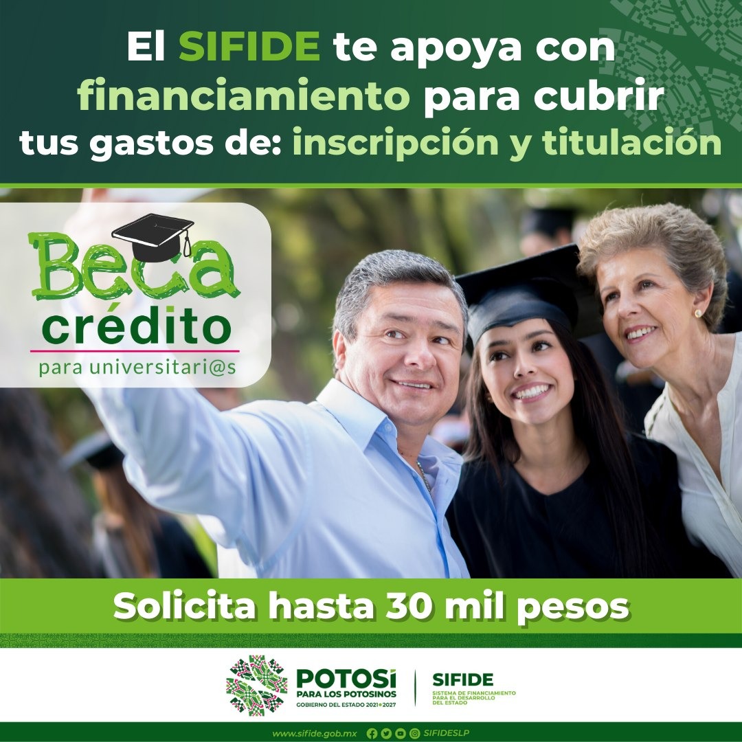 Siguiendo la labor del Gobernador del Estado, Ricardo Gallardo Cardona, de apoyar a las y los estudiantes de todos los niveles educativos, el Sistema de Financiamiento para el Desarrollo del Estado (Sifide) incrementó el monto máximo del programa Beca Crédito, con hasta 30 mil pesos, para que las y los jóvenes universitarios puedan acceder a un financiamiento para cubrir gastos de titulación, manutención e inscripción, además de que por primera vez se otorgó a un estudiante de posgrado.