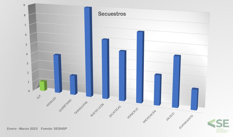 El Estado potosino, en comparación con entidades colindantes, durante el primer trimestre del año, registró un total de cuatro casos de feminicidio, mientras que Veracruz, Nuevo León y Jalisco, registraron un total de 19, 15 y nueve, respectivamente. Por otro lado, en el delito de secuestro San Luis Potosí, registró un solo caso en primer trimestre de 2023, mientras que estados como Tamaulipas, Veracruz y Nuevo León presentaron nueve, siete y seis, respectivamente.