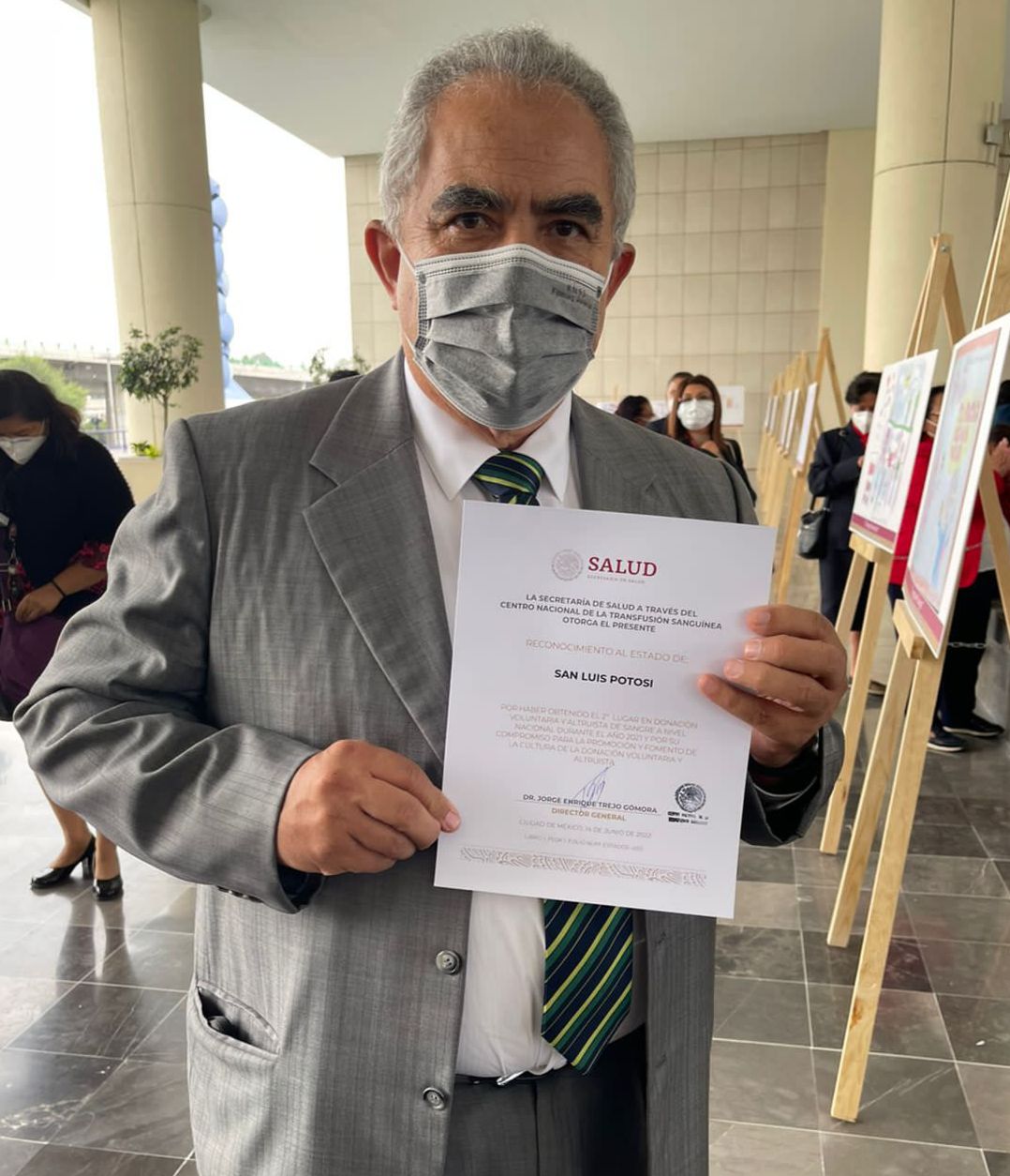 En representación del Gobernador del Estado Ricardo Gallardo Cardona, el secretario de Salud, Daniel Acosta Díaz de León recibió dicha distinción y manifestó que el esfuerzo que le fue reconocido a la Entidad se debe a la generosidad de cada persona que acude a donar sangre de manera voluntaria. Así mismo, enalteció la labor que realiza el Centro Estatal de Transfusión Sanguínea (CETS), donde se promociona y gestiona con empresas privadas y públicas, población en general e instituciones educativas la colaboración de las personas para donar sangre y salvar vidas.