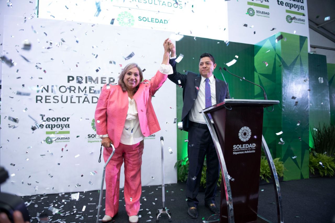 El Gobernador de San Luis Potosí Ricardo Gallardo Cardona acudió este viernes a la presentación del Primer Informe de Resultados de la alcaldesa de Soledad de Graciano Sánchez, Leonor Noyola Cervantes a quien reconoció por las acciones emprendidas durante el primer año de gestión y destacó el trabajo en conjunto que se ha impulsado a favor de los soledenses, ya que por primera vez un Gobierno Estatal incluye a la demarcación en obras de la zona metropolitana para que acceda al desarrollo a la par fe la capital y en un período breve se convierta en el municipio más dinámico del Estado.