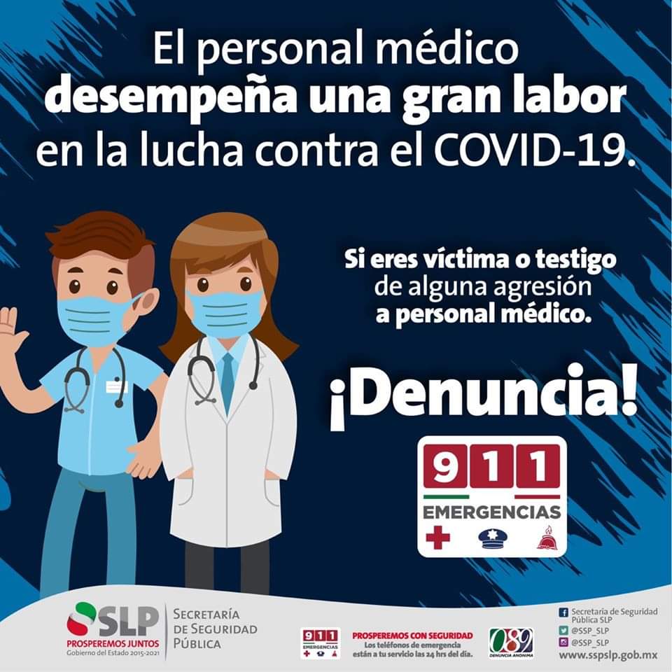 La Secretaria de Seguridad Pública del Estado exhorta a la población en general son testigos o víctimas de alguna agresión física o verbal, a realizar la denuncia a las Líneas de Emergencia 9-1-1 y 089 Denuncia Anónima, el personal médico desempeña una gran labor en la lucha contra el COVID-19, por lo que merecen el respeto y respaldo de la población.