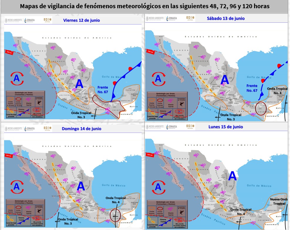 El pronóstico meteorológico para las próximas horas indicia que el frente No. 67 con características de estacionario sobre el centro y oriente del Golfo de México, continúe interaccionando con un canal de baja presión sobre el sur de dicho Golfo, manteniendo el potencial de lluvias muy fuertes a puntuales intensas en el oriente y sureste del territorio nacional, así como en la Península de Yucatán. La onda tropical No. 3, al sur de las costas de Guerrero, y un canal de baja presión sobre el noroeste, occidente y centro del país, ocasionarán lluvias puntuales fuertes acompañadas de descargas eléctricas y posibles granizadas en dichas regiones.