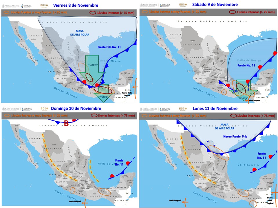 De acuerdo con los pronósticos para las próximas horas, se prevé que el Frente Frío Número 11 interaccionará con un canal de baja presión en el suroeste del Golfo de México, lo cual incrementará la nubosidad y originará lluvias fuertes a intensas en el noreste, oriente y sureste de México. La masa de aire polar asociada, cubrirá el noreste, centro y oriente del país, y originará descenso de temperatura en dichas regiones, además de evento Norte con rachas superiores a 80 kilómetros por hora (km/h) en el Golfo de Tehuantepec, y rachas superiores a 70 km/h con oleaje de 2 a 4 metros de altura en el litoral de Tamaulipas y Veracruz. Un canal de baja presión en el occidente del país y la aproximación de una nueva onda tropical al sur de la Península de Yucatán, ocasionarán lluvias vespertinas con descargas eléctricas y posible caída de granizo.