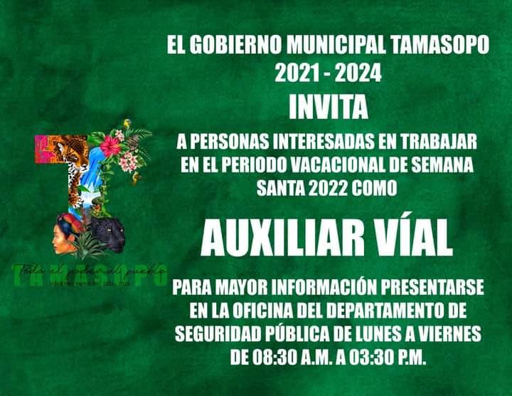 Tamasopo.S.L.P.- Con el fin de brindar un mejor servicio vial a los visitantes, la dirección de Seguridad Pública y Tránsito Municipal a cargo de Esteban Yañez Garnica dio a conocer que se emitió una convocatoria para la contratación temporal de 15 personas que ayudarán a los agentes a dar vialidad durante el periodo vacacional