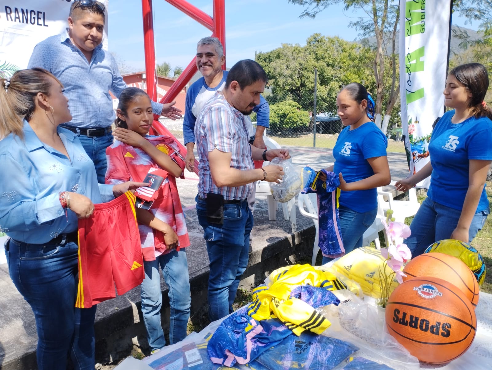 Tamasopo..- El dĆa de hoy el Presidente Municipal Luis Alberto Abundis Rangel acompaƱado de funcionarios municipales, autoridades ejidales y educativas estuvieron presentes en la entrega de uniformes a jóvenes futbolistas de la Escuela Telesecundaria JuliĆ”n de los Reyes en la localidad de El Carpintero, en donde ademĆ”s inauguraron la rehabilitación de una cancha deportiva la cual se encontraba deteriorada.