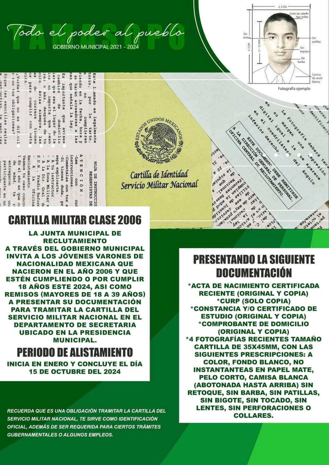 La Junta Municipal de Reclutamiento de Tamasopo convoca a los jóvenes de clase 2006 y remisos a realizar su trámite de expedición de la cartilla de identidad del servicio militar ya que a partir del día de hoy podrán realiza su tramite.
