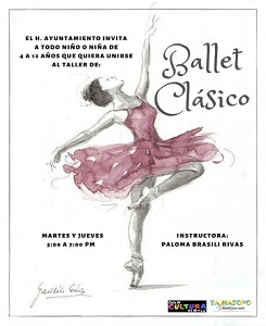 Indico que el taller de guitarra clásica será de lunes, miércoles y viernes con horario de 3 de la tarde, el taller de Dibujo y pintura será los martes a la 5 de la tarde y domingo a las 11am,  el grupo de ballet clásico será los martes y jueves a las 5 de la tarde y el baile de salón será dirigido para las personas de la tercera edad los días viernes a las 6 de la tarde, para más información puede pasar a la oficinas ubicadas en la casa de cultura con horario de 8:30 a 3 de la tarde.