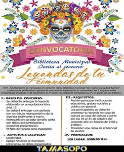 Tamasopo.- Con motivo de los festejos de Todos Santos el departamento de Biblioteca Municipal está invitando a la población para que participe al concurso de Leyendas en tu Comunidad en donde los participantes deberán entregar una reseña escrita de dicha leyenda.