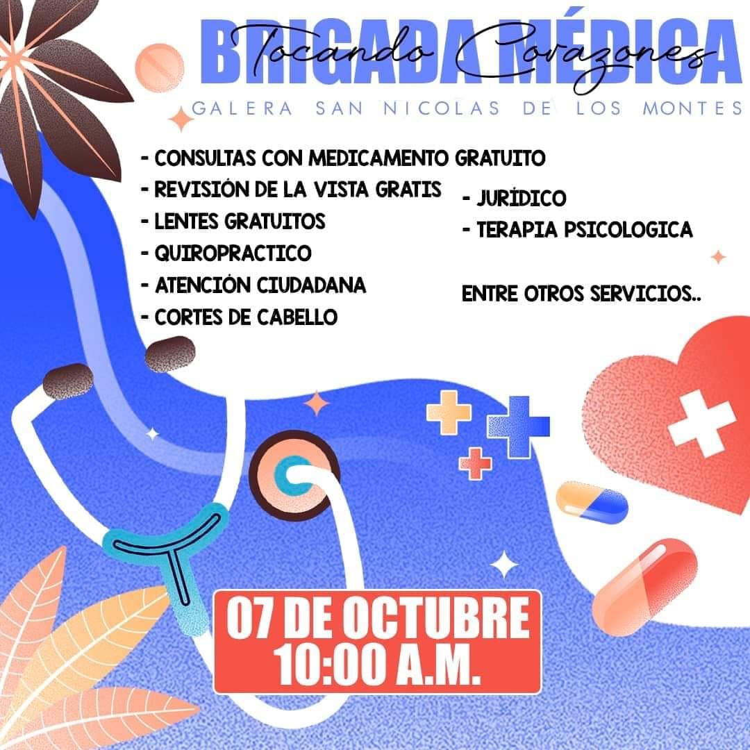 Informó que en punto de las 10:00 a.m. en la Galera de San Nicolás de los Montes se tendrá la brigada médica gratuita, por lo que se le está haciendo la invitación a toda la población de este sector que esté al pendiente ya que está brigada cuenta además con la consulta médica gratis, examen de la vista, Quiropráctico, corte de pelo, atención psicológica y jurídica.