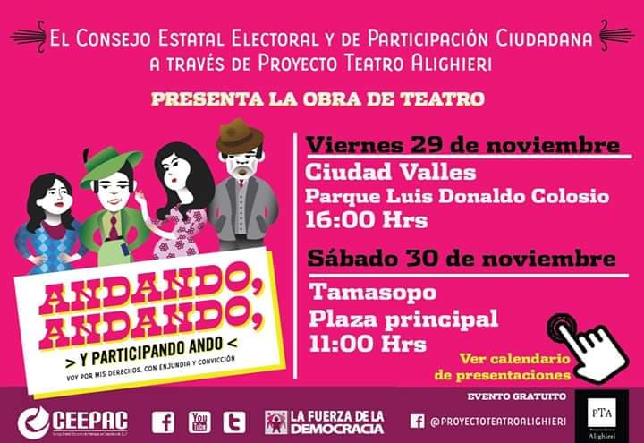 Dijo que este evento es realizado por el Consejo Estatal Electoral y de Participación Ciudadana, quien estará presentando una obra de teatro denominada: “Andando, andando… y participando ando”, esto como parte de la campaña “La Fuerza de la Democracia”, la cual tiene como objetivo fomentar las diversas formas de participación ciudadana, retomando los valores tradicionales de vida en común, colectiva y solidaria. La obra esta dirigida para todo público.