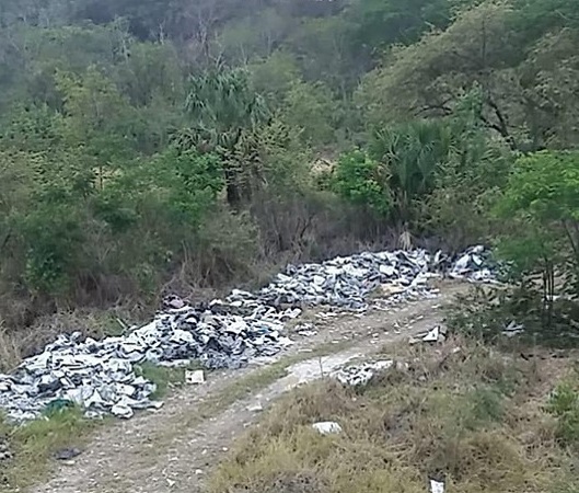 Desde el pasado miércoles pobladores encontraron cientos de costales tirados a 300 metros del charco azul y pegado a un potrero, lo que puede ocasionar la muerte de vida silvestre y doméstica ya que los plásticos pueden contener alguna sustancia toxica.