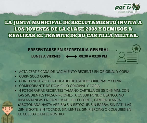 Tamasopo.- La Junta Municipal de Reclutamiento hace un atento llamado a los jóvenes clase 2008, así como a remisos, para que acudan a realizar el trámite de su Cartilla del Servicio Militar Nacional, documento indispensable para cumplir con esta obligación cívica.