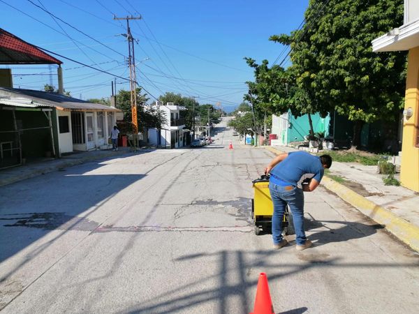 Es a través de la Coordinación de Desarrollo Social que se estÔn llevando a cabo trabajos de bacheo en la calle principal de las diferentes secciones de este amplio sector, con trabajos de corte y demolición del concreto dañado, realizÔndose compactación de base y reposición con concreto reforzado, así como malla de acero.