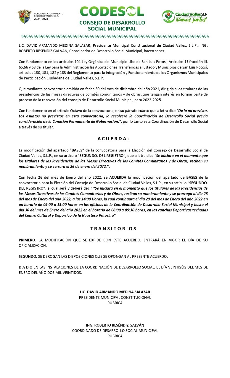ACUERDAN MODIFICACIÓN DE LA CONVOCATORIA PARA INTEGRAR EL CONSEJO DE DESARROLLO SOCIAL MUNICIPAL